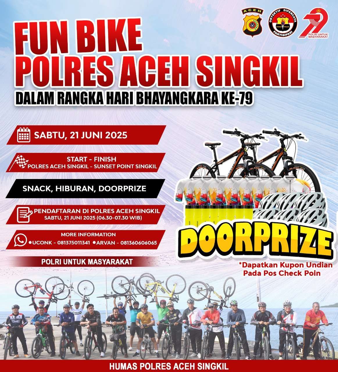 KBRN, Aceh Singkil: Dalam rangka memeriahkan Hari Bhayangkara ke-79, Kepolisian Resor (Polres) Aceh Singkil akan melaksanakan kegiatan olahraga Funbike atau Sepeda Santai pada Sabtu, (21/6/2025). Kegiatan terbuka untuk umum, yang bisa diikuti masyarakat.