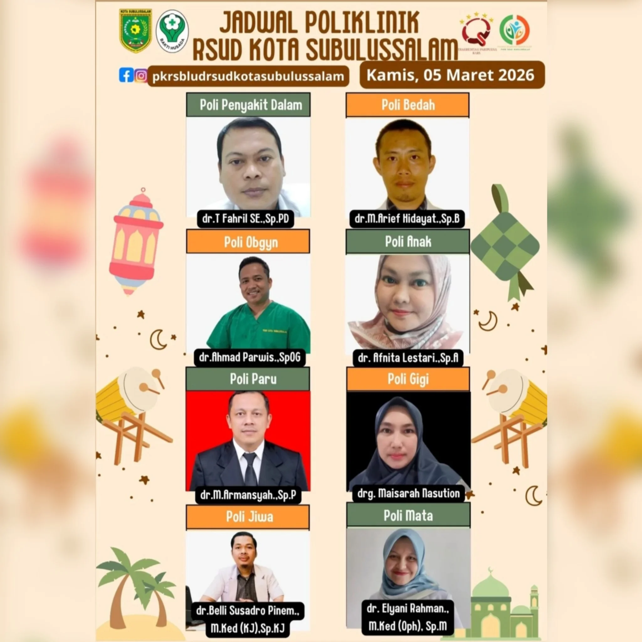 RRI.CO.ID, Subulussalam : Rumah Sakit Umum Daerah (RSUD) Kota Subulussalam kembali merilis jadwal operasional poliklinik spesialis untuk hari Kamis 5 Maret 2026. Penjadwalan ini bertujuan agar pasien dapat merencanakan kunjungan medis dengan lebih efisien.