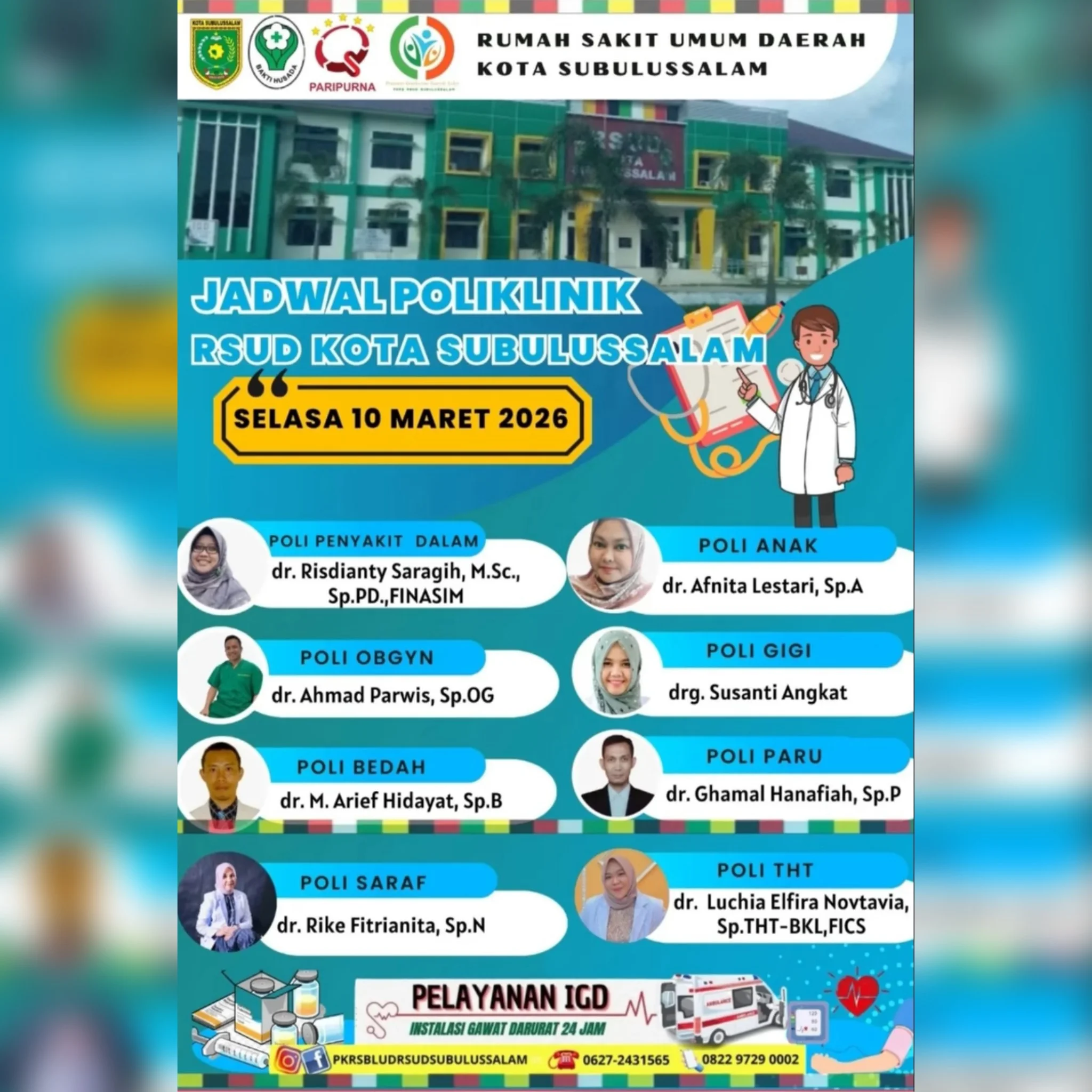 Jadwal Poliklinik RSUD Subulussalam Selasa 10 Maret 2026