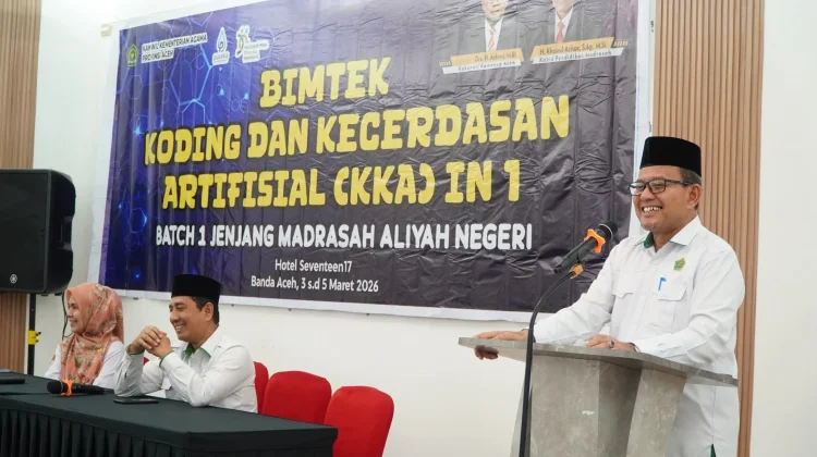 RRI.CO.ID, Banda Aceh - Kantor Wilayah Kementerian Agama Provinsi Aceh menggelar Bimbingan Teknis (Bimtek) Koding dan Kecerdasan Artifisial (KKA) bagi guru Madrasah Aliyah (MA) sebagai upaya memperkuat kesiapan madrasah menghadapi transformasi digital pendidikan. Kegiatan tersebut dibuka Kepala Kanwil Kemenag Aceh, Azhari, di Hotel Seventeen, Setui, Banda Aceh, Selasa 3 Maret 2026.