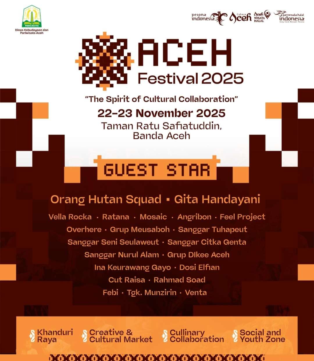 Festival ini ditata dalam empat zona besar—Khanduri Raya, Creative & Cultural Market, Culinary Collaboration, dan Social & Youth Zone—yang memberikan ruang transaksi, kolaborasi, dan pertunjukan sekaligus. Pola zonasi ini diharapkan menciptakan alur kunjungan yang nyaman dan mendorong terjadinya aktivitas ekonomi yang lebih merata di seluruh area festival.