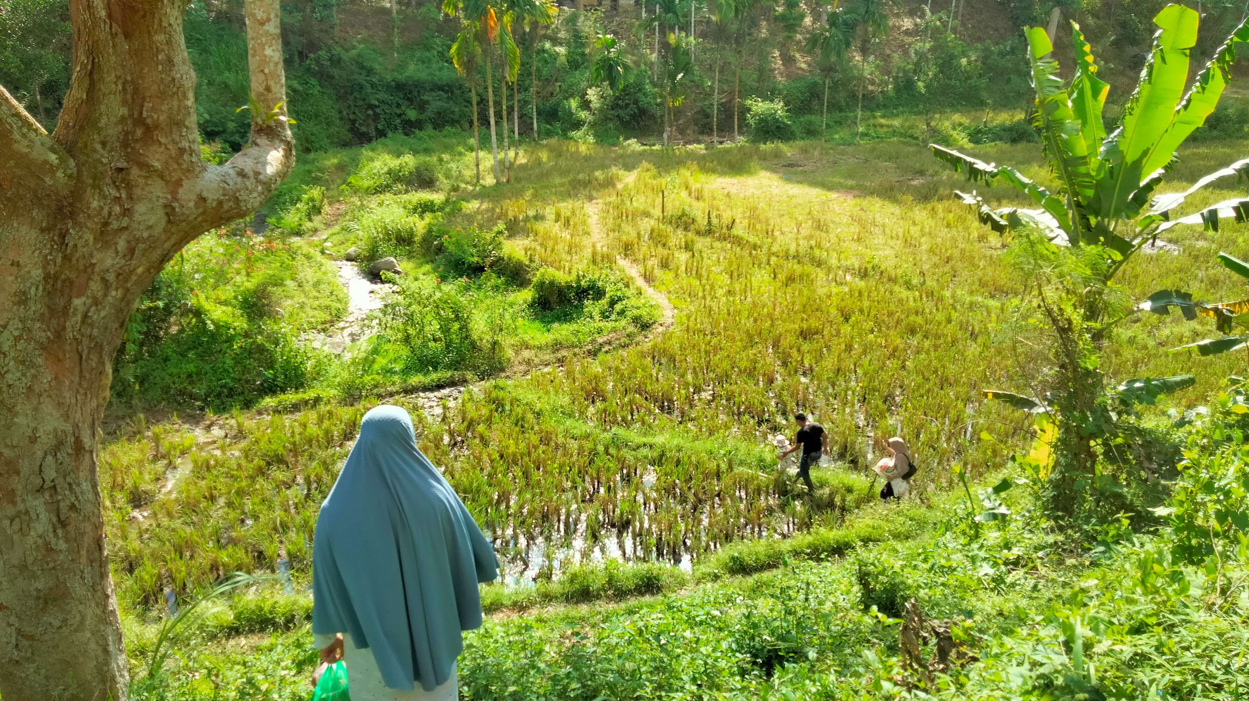 Perjalanan dilanjutkan sekitar 500 meter hingga menemui perkebunan durian warga. Pemandangan lembah, sungai dan bukit mendominasi perjalanan.