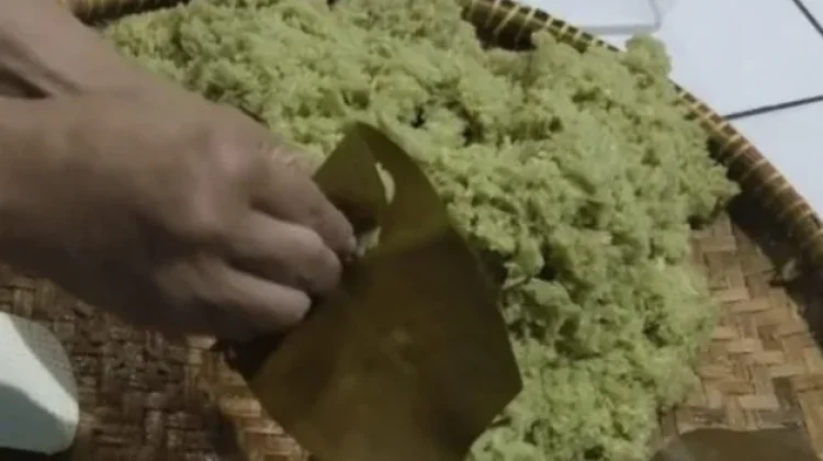 • Siram beras ketan yang sudah dikukus( setengah matang) dengan air daun katuk dan daun pandan yang sudah diblender, aduk hingga merata.