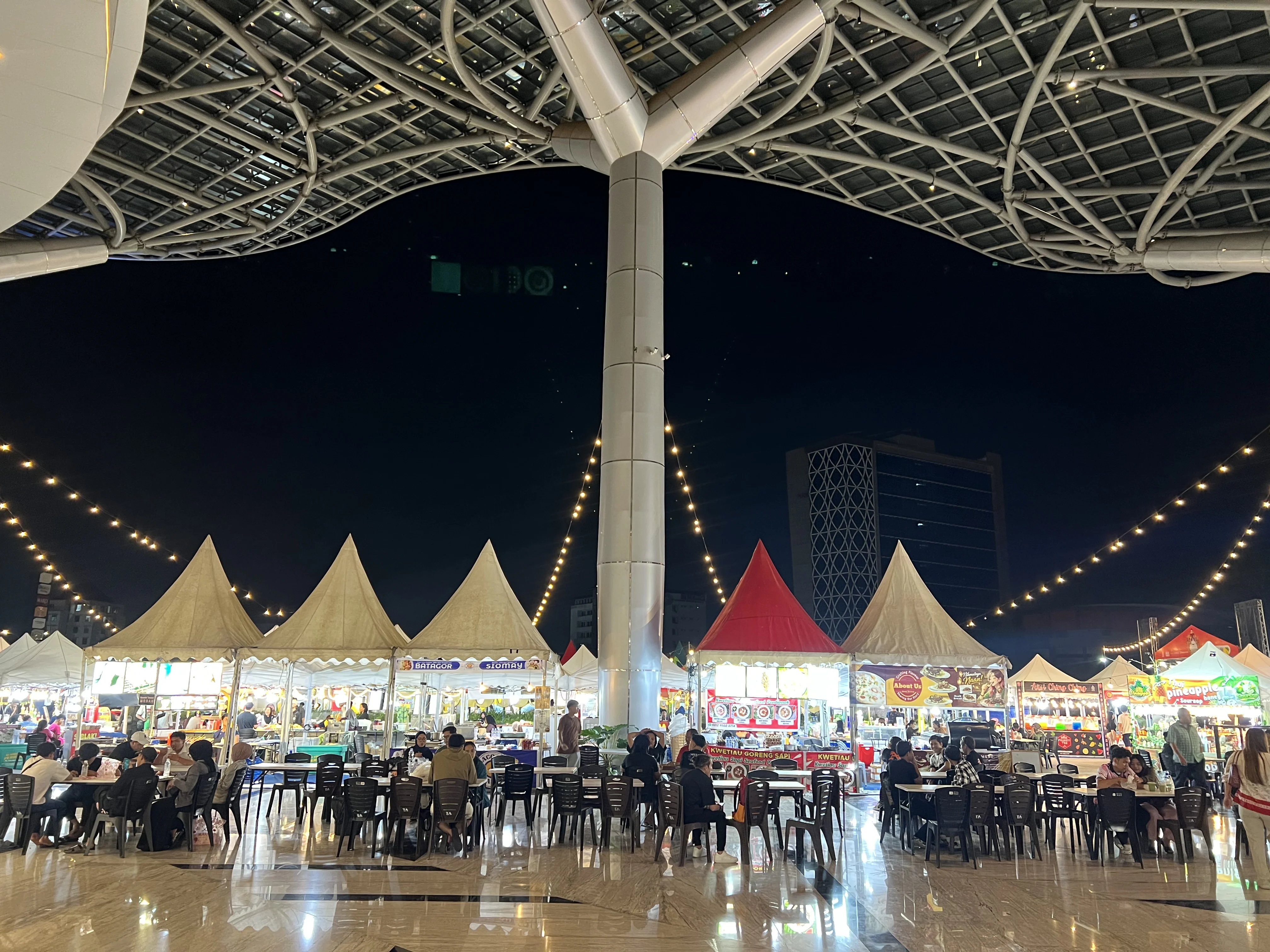 Suasana bazar malam ini tampak begitu hangat dengan dekorasi lampu gantung yang membentang di atas area makan. Para pengunjung, mulai dari anak muda hingga keluarga, terlihat asyik bercengkerama sambil menikmati hidangan seperti batagor, siomay, kwetiau goreng, hingga minuman segar yang tersedia di berbagai gerai tenda kerucut.
