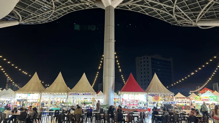 Suasana bazar malam ini tampak begitu hangat dengan dekorasi lampu gantung yang membentang di atas area makan. Para pengunjung, mulai dari anak muda hingga keluarga, terlihat asyik bercengkerama sambil menikmati hidangan seperti batagor, siomay, kwetiau goreng, hingga minuman segar yang tersedia di berbagai gerai tenda kerucut.
