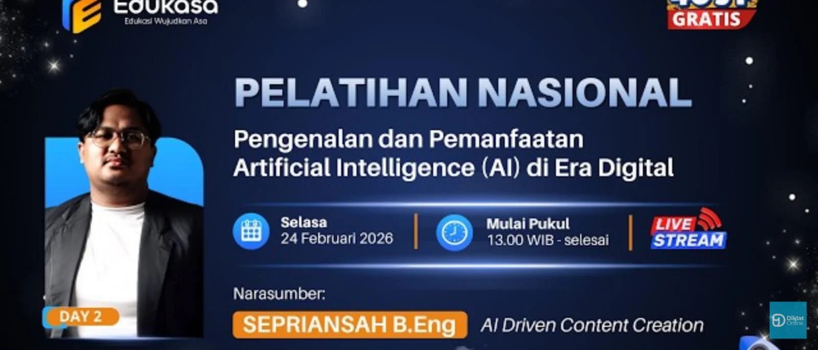 RRI.CO.ID, Jakarta — Lembaga Edukasa menggelar kelas pelatihan bertajuk Pengenalan dan Pemanfaatan AI di Era Digital, dengan sub tema Artificial Intelligence (AI) sebagai asisten digital dalam pembuatan produk digital, Selasa, 24 Februari 2026. Kegiatan ini berlangsung secara daring melalui YouTube pukul 13.00 hingga 15.00 WIB dan diikuti ribuan peserta dari berbagai daerah.