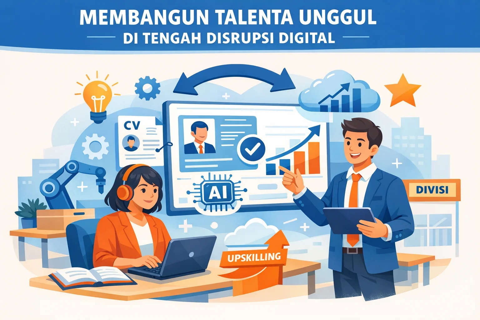 Proses manajemen talenta mencakup identifikasi potensi, talent mapping, program pengembangan, hingga retensi karyawan. Dengan HR analytics, organisasi dapat memetakan kinerja dan potensi secara lebih akurat. Perencanaan suksesi juga menjadi bagian penting, agar calon pemimpin masa depan disiapkan secara sistematis.