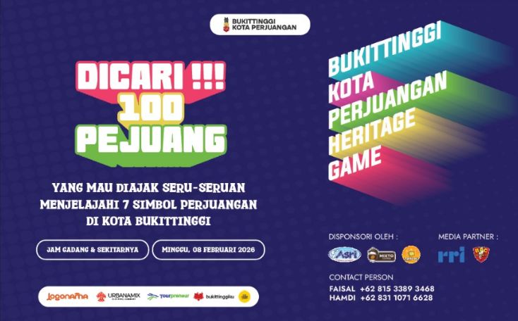 RRI.CO.ID, Bukittinggi - Pada 8 Februari 2026 ini akan dilaksanakan Bukittinggi Kota Perjuangan Heritage Game di Kota Bukittinggi. Ini adalah sebuah kegiatan wisata jalan kaki sambil olahraga dan belajar mengenali seluk-beluk kota yang dikemas dalam tajuk permainan pusaka (heritage game). Peserta akan diajak mengunjungi jejak-jejak perjuangan yang tersebar di banyak sudut kota Bukittinggi.