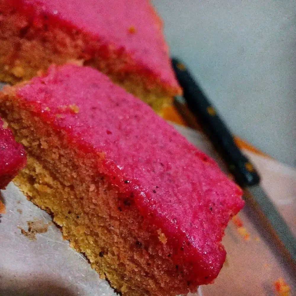 Setelah adonan dasar siap, tambahkan tepung terigu dan jus buah naga secara bergantian. Aduk perlahan hingga semua bahan tercampur rata dan tidak ada gumpalan. Pastikan adonan memiliki tekstur yang lembut dan tidak terlalu cair. Kemudian tuang adonan ke dalam loyang yang telah disiapkan, ratakan permukaannya, dan panggang dalam oven hingga matang. Untuk memastikan kematangan, tusuk bagian tengah kue menggunakan lidi; jika tidak ada adonan yang menempel, berarti kue sudah matang dan siap diangkat.