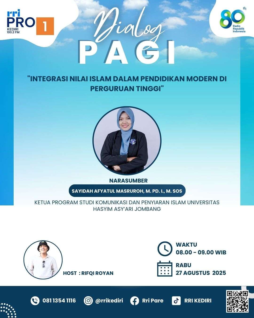 KBRN, Kediri: Integrasi nilai-nilai Islam dalam pendidikan modern menjadi fokus pembahasan dalam program Dialog Pagi, RRI Kediri, Rabu (27/8/2025). Dosen Universitas Hasyim Asy’ari (Unhasy), Sayidah Masruroh, M.Pd.I., M.Sos., menekankan pentingnya hal tersebut di tingkat perguruan tinggi.