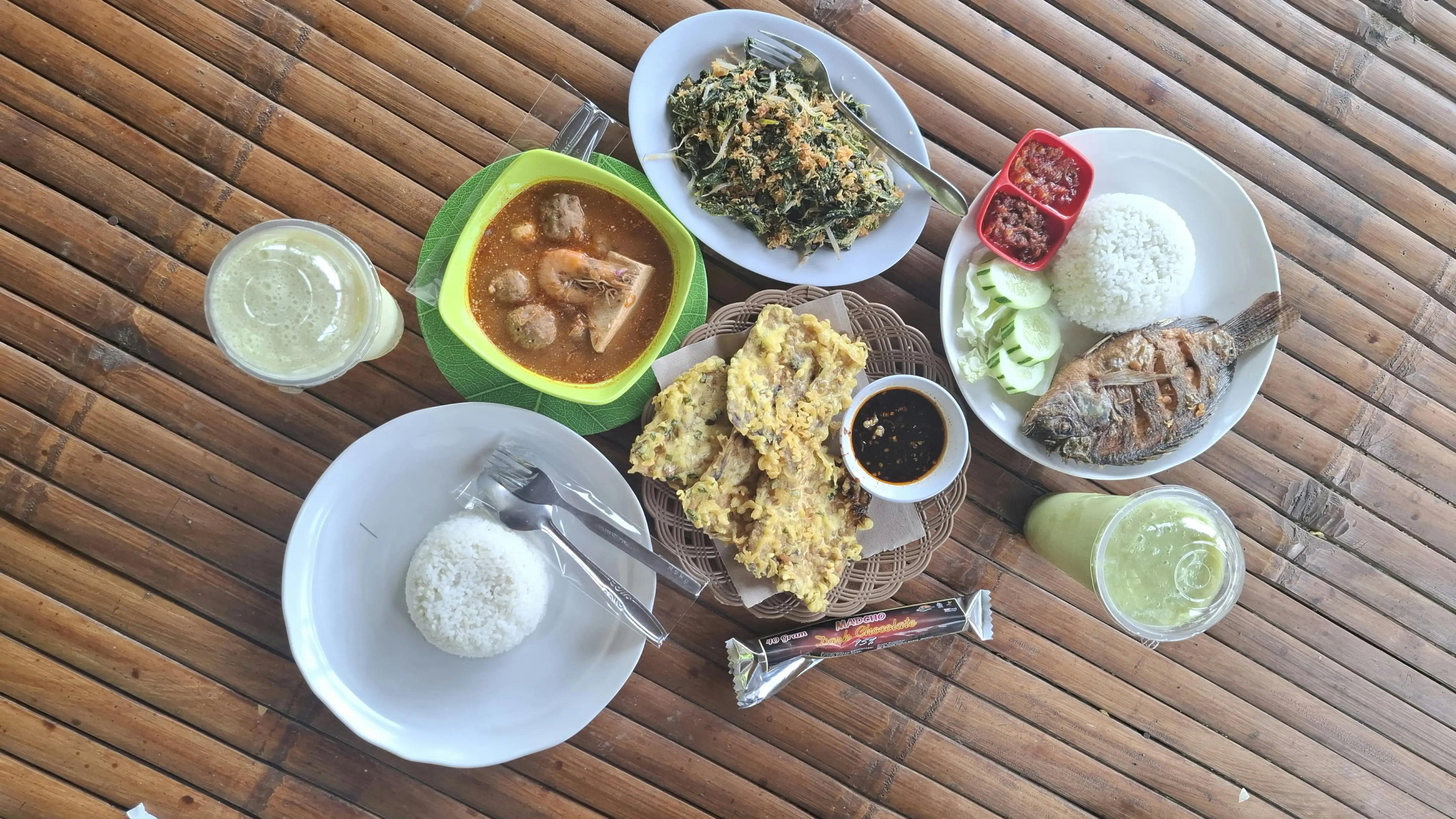 “Saya kalau liburan suka main kesini, tempatnya sejuk harganya juga murah-murah, ini saya beli ikan goreng sama minuman cokelat, urap juga enak apalagi cokelatnya yang dark ini saya suka sekali,” ujarnya.