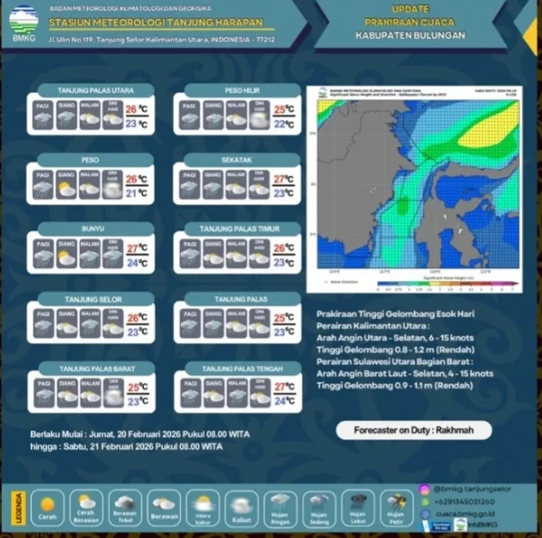 RRI.CO.ID, Malinau - Prakiraan cuaca di Kabupaten Bulungan berpotensi hujan dengan intensitas ringan pada 20-21 Februari. Informasi itu disampaikan, Haifd, Prakirawan Badan Meteorologi, Klimatologi, dan Geofisika (BMKG) Tanjung Harapan, Jumat (20/02/2026).