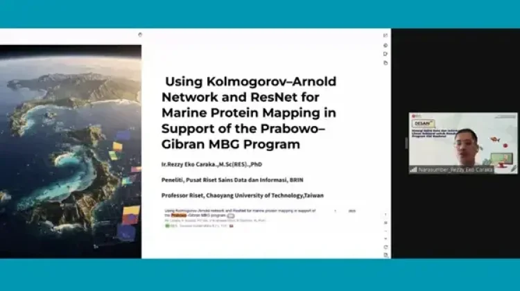 Peneliti PRSDI BRIN, Rezzy Eko Caraka, menjelaskan bahwa riset bertajuk “Kolmogorov–Arnold Network and ResNet for Marine Protein Mapping in Support of the Prabowo–Gibran MBG Program” bertujuan memetakan potensi protein laut Indonesia sebagai alternatif sumber gizi dalam diversifikasi pangan MBG.