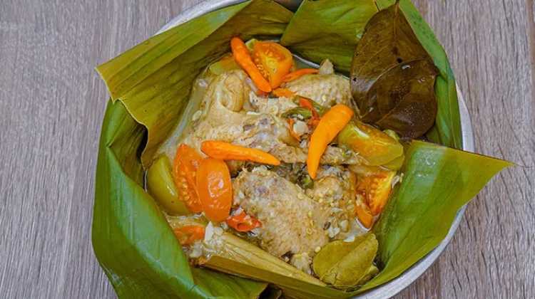 - Tutup dengan daun pisang, kemudian tutup wajan/panci, masak hingga kurang lebih 20-30 menit atau hingga ayam empuk.
