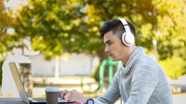 Fokus yang mendalam terlihat jelas ketika seseorang mampu menyelaraskan diri dengan tugas di layar laptop sembari menikmati udara segar yang mengalir bebas. Penggunaan penyuara telinga (headphones) menjadi alat isolasi akustik yang krusial untuk menciptakan ruang kerja personal di tengah area publik.
