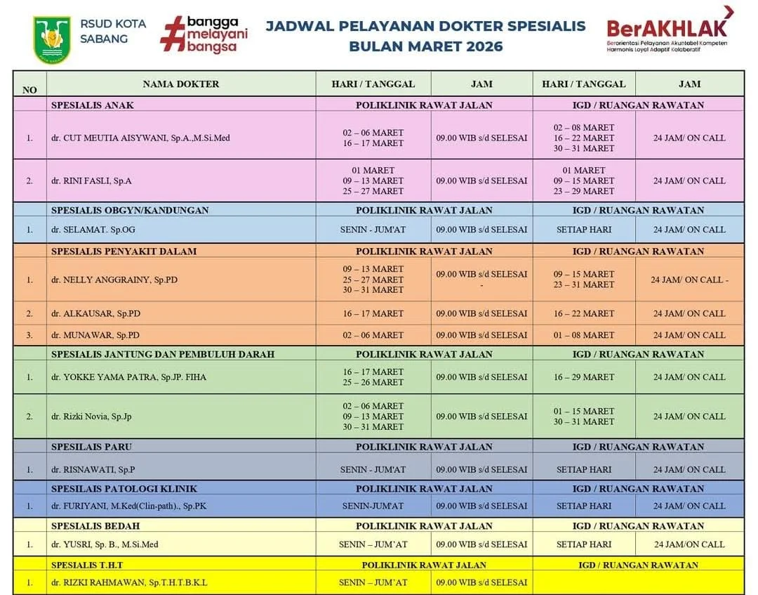 Berikut jadwal Nama Dokter Spesialis yang bertugas di Poliklinik Rawat Jalan dan IGD atau Ruang Rawatan RSUD Kota Sabang pekan pertama bulan November adalah:
