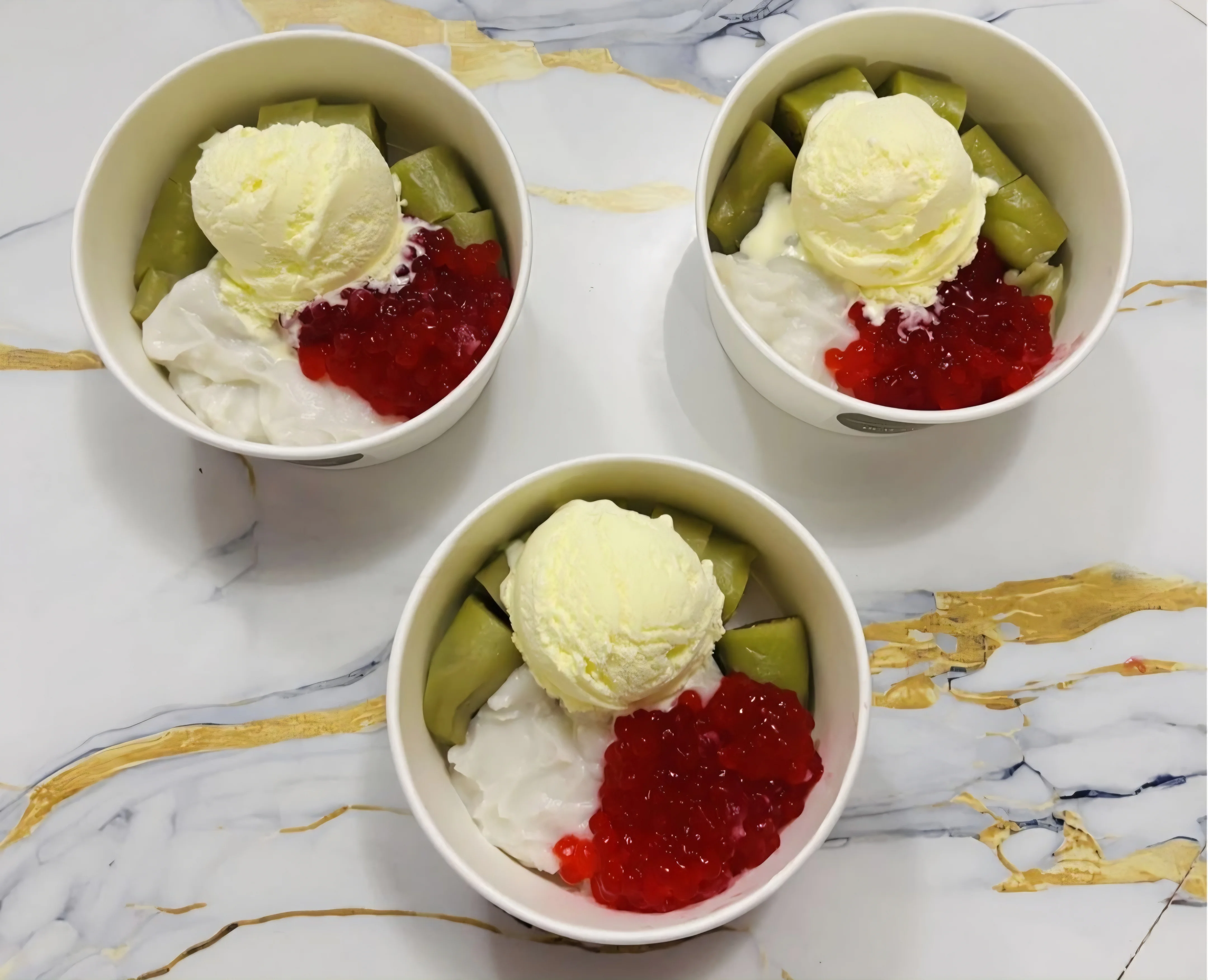 Modifikasi kuliner khas Makassar ini menghadirkan perpaduan unik antara tekstur lembut pisang yang dibalut adonan hijau kenyal dengan dinginnya es krim vanila yang lumer di mulut, memberikan sensasi berbuka yang berbeda dari biasanya.
