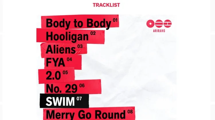 Album "Arirang" menghadirkan 14 lagu dengan total durasi 41 menit 13 detik. Daftar lagu itu mencakup "Body to Body", "Hooligan", "Aliens", "FYA", "2.0", "Merry Go Round", hingga "Into the Sun".