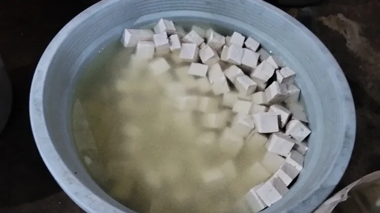 Keluarkan tahu dari cetakan, lalu potong sesuai selera. Untuk tekstur lebih padat, tahu dapat direndam dalam air dingin selama sekitar 30 menit.